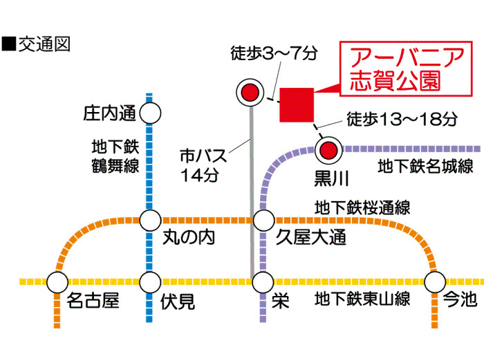 Nagoya Municipal Tsurumai Line 『 Shonaidori Station 』 + 17 minutes walk Nagoya Municipal Meijo Line 『 Sakae Station 』 14 minutes bus ( to『志賀公園前』 bus stop) + 3 minutes walk |