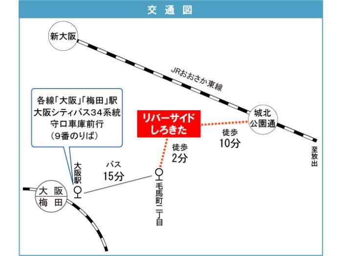 JR Tokaidou・Sanyou 『 Osaka Station 』 13 minutes bus ( to『毛馬町二丁目』 bus stop) + 4 minutes walk Osaka Municipal Tanimachi Line 『 Tenjinbashisuji 6chome Station 』 + 24 minutes walk |