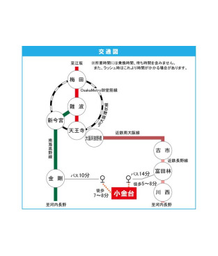 Nankai Koya Line 『 Kongo Station 』 10 minutes bus ( to『小金台二丁目南 』 bus stop) + 7 minutes walk Kintetsu Nagano Line 『 Takitani-fudo Station 』 + 25 minutes walk Kintetsu Nagano Line 『 Kawanishi Station 』 + 11 minutes walk |