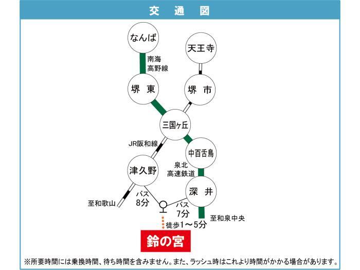JR Hanwa Line 『 Tsukuno Station 』 8 minutes bus ( to『鈴の宮団地センター』 bus stop) + 1 minutes walk JR Hanwa Line 『 Tonoki Station 』 + 29 minutes walk |