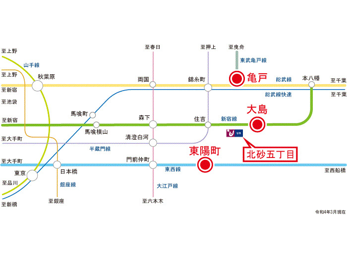 JR Sobu Line 『 JB23 Kameido Station 』 7 minutes bus ( to『北砂五丁目団地』 bus stop) + 1 minutes walk Tobu Kameido Line 『 TS44 Kameido Station 』 7 minutes bus ( to『北砂五丁目団地』 bus stop) + 1 minutes walk Tokyo Metro Tozai Line 『 T14 Toyocho Station 』 9 minutes bus ( to『北砂三丁目』 bus stop) + 6 minutes walk |