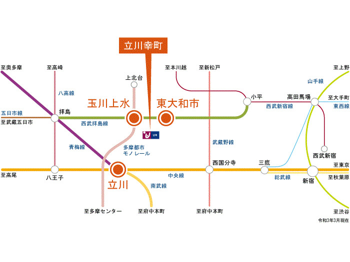 Tama Toshi Mono Rail 『 Tamagawa Josui Station 』 + 15 minutes walk JR Chuo Line 『 Tachikawa Station 』 20 minutes bus ( to『幸町団地』 bus stop) + 3 minutes walk JR Nanbu Line 『 Tachikawa Station 』 20 minutes bus ( to『幸町団地』 bus stop) + 3 minutes walk JR Ome Line 『 Tachikawa Station 』 20 minutes bus ( to『幸町団地』 bus stop) + 3 minutes walk |