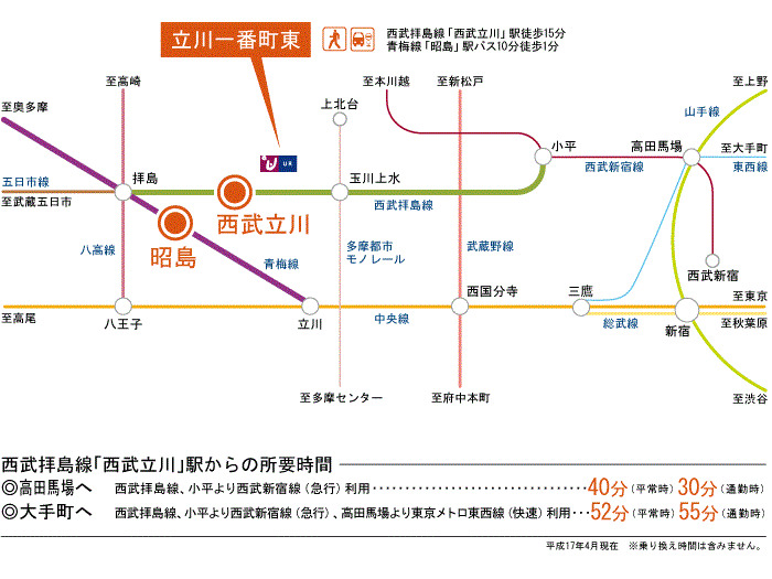 Seibu Haijima Line 『 Seibu Tachikawa Station 』 4 minutes bus ( to『グリーンタウン武蔵村山』 bus stop) + 3 minutes walk JR Ome Line 『 Akishima Station 』 9 minutes bus ( to『グリーンタウン武蔵村山』 bus stop) + 3 minutes walk JR Chuo Line 『 Tachikawa Station 』 20 minutes bus ( to『グリーンタウン武蔵村山』 bus stop) + 3 minutes walk |