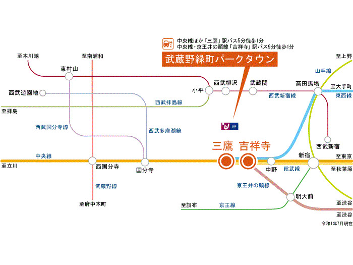 JR Chuo Line 『 Kichijoji Station 』 10 minutes bus ( to『緑町住宅』 bus stop) + 3 minutes walk Seibu Shinjuku Line 『 SS14 Musashi-Seki Station 』 5 minutes bus ( to『緑町住宅』 bus stop) + 6 minutes walk |