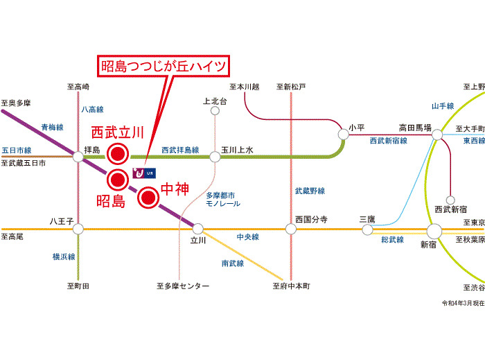 JR Ome Line 『 Nakagami Station 』 + 13 minutes walk Seibu Haijima Line 『 Seibu Tachikawa Station 』 + 25 minutes walk |