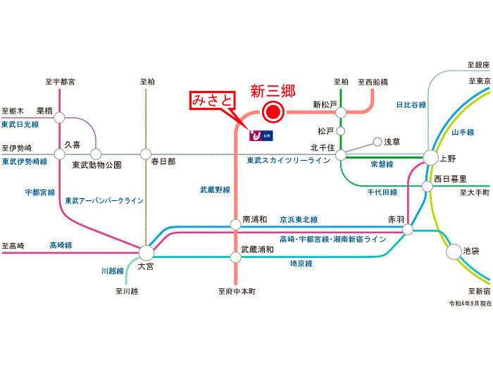 JR Musashino Line 『 Yoshikawa Minami Station 』 + 12 minutes walk JR Musashino Line 『 Shin Misato Station 』 1 minutes bus ( to『公園前[三郷市]』 bus stop) + 1 minutes walk |