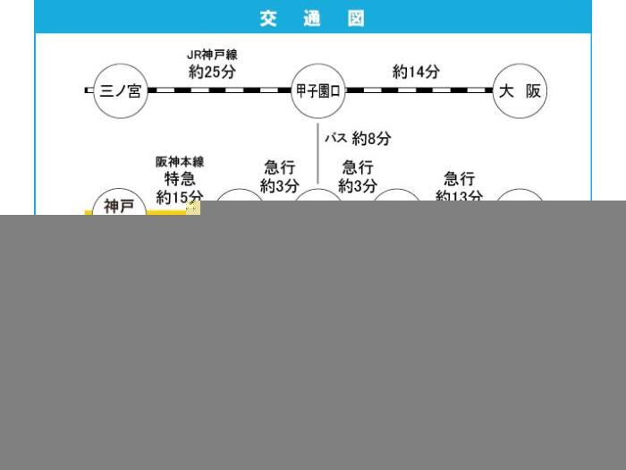 Hanshin Main Line 『 Koshien Station 』 4 minutes bus ( to『南甲子園小学校前』 bus stop) + 6 minutes walk Hanshin Main Line 『 Nishinomiya Station 』 + 25 minutes walk |