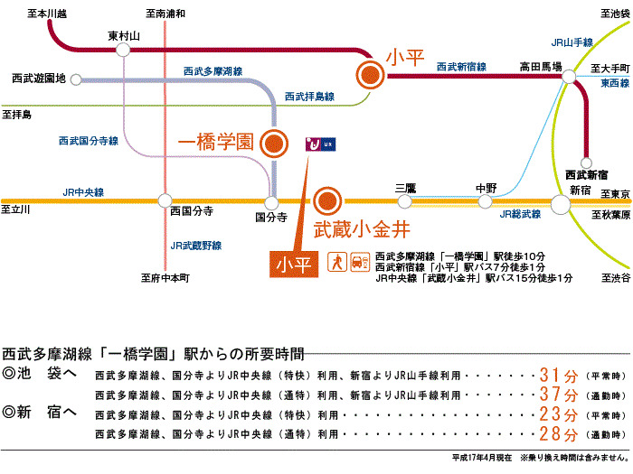 JR Chuo Line 『 JC16 Kokubunji Station 』 13 minutes bus ( to『小平団地中央』 bus stop) + 1 minutes walk Seibu Shinjuku Line 『 SS19 Kodaira Station 』 6 minutes bus ( to『小平団地中央』 bus stop) + 1 minutes walk JR Chuo Line 『 Musahi Koganei Station 』 15 minutes bus ( to『小平団地中央』 bus stop) + 1 minutes walk |