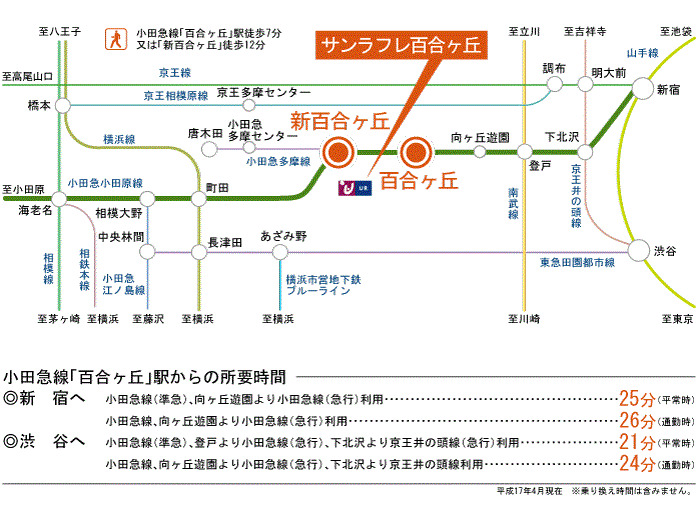 Odakyu Odawara Line 『 Shin Yurigaoka Station 』 + 10 minutes walk Tokyu Denentoshi Line 『 Azamoino Station 』 41 minutes bus ( to『管理事務所前』 bus stop) + 2 minutes walk |