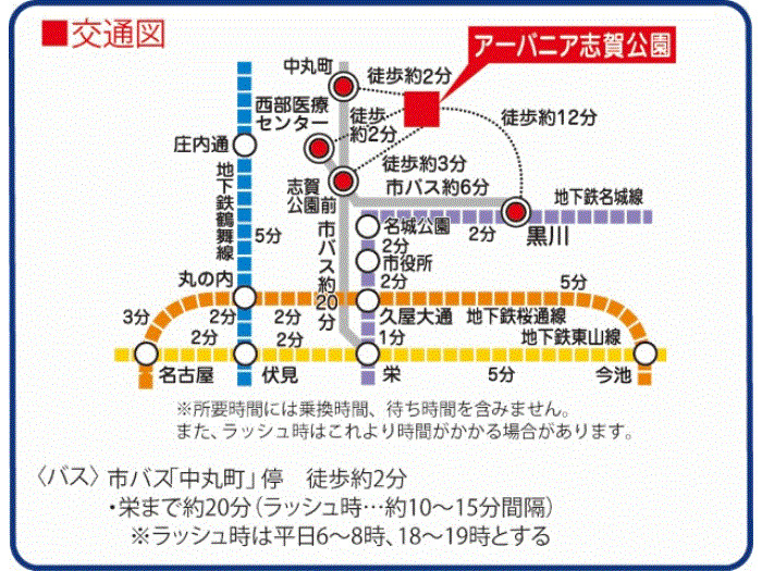 Nagoya Municipal Tsurumai Line 『 Shonaidori Station 』 + 17 minutes walk Nagoya Municipal Meijo Line 『 Sakae Station 』 14 minutes bus ( to『志賀公園前』 bus stop) + 3 minutes walk |