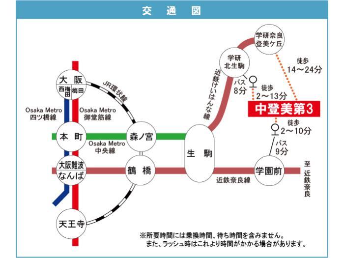 Kintetsu Nara Line 『 Gakuen Mae Station 』 9 minutes bus ( to『中登美ヶ丘団地』 bus stop) + 2 minutes walk Kintetsu Keihanna Line 『 Gakkenkitaikoma Station 』 8 minutes bus ( to『西登美ケ丘二丁目』 bus stop) + 2 minutes walk |