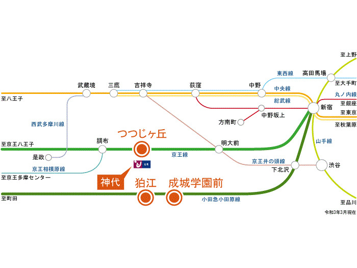 Odakyu Odawara Line 『 Seijo Gakuen Mae Station 』 14 minutes bus ( to『神代団地中央』 bus stop) + 10 minutes walk |