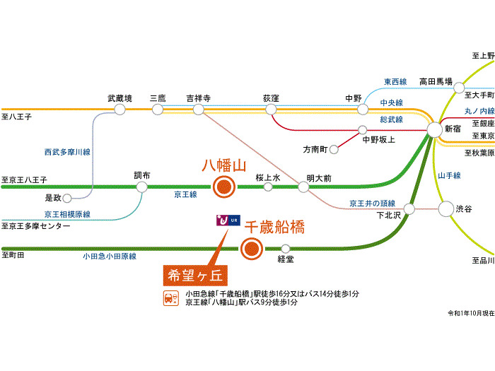 Keio Line 『 KO10 Hachimanyama Station 』 5 minutes bus ( to『希望ヶ丘団地』 bus stop) + 1 minutes walk Odakyu Odawara Line 『 Chotose Funabashi Station 』 + 16 minutes walk |
