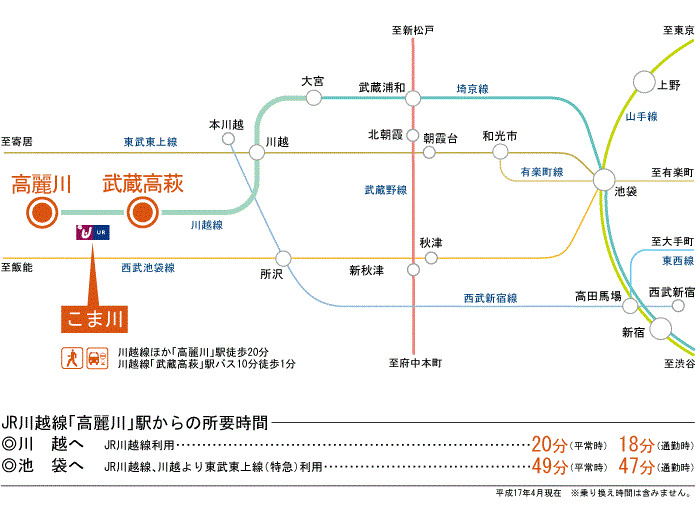 JR Kawagoe Line 『 Musashi Takahagi Station 』 5 minutes bus ( to『高麗川団地』 bus stop) + 2 minutes walk Seibu Ikebukuro Line 『 Hannou Station 』 28 minutes bus ( to『高麗川団地』 bus stop) + 2 minutes walk |