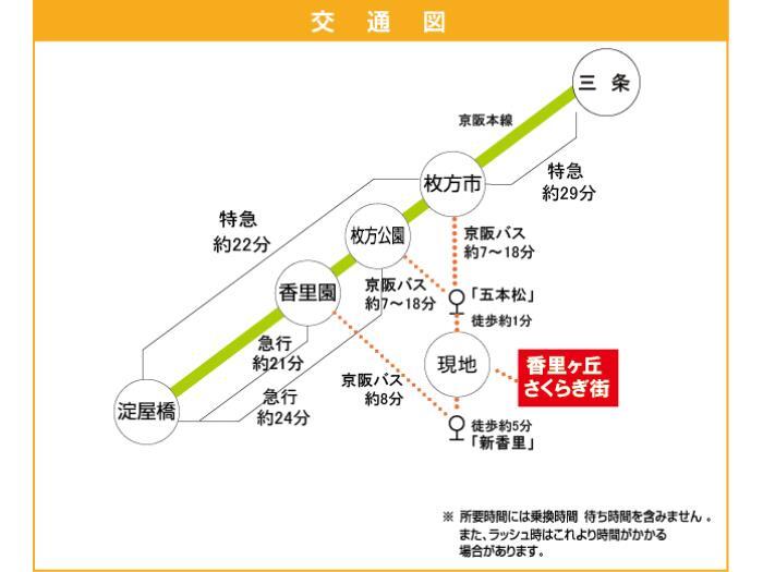 Keihan Main Line 『 Korien Station 』 10 minutes bus ( to『新香里』 bus stop) + 6 minutes walk Keihan Main Line 『 Hirakata shi Station 』 18 minutes bus ( to『五本松』 bus stop) + 2 minutes walk |