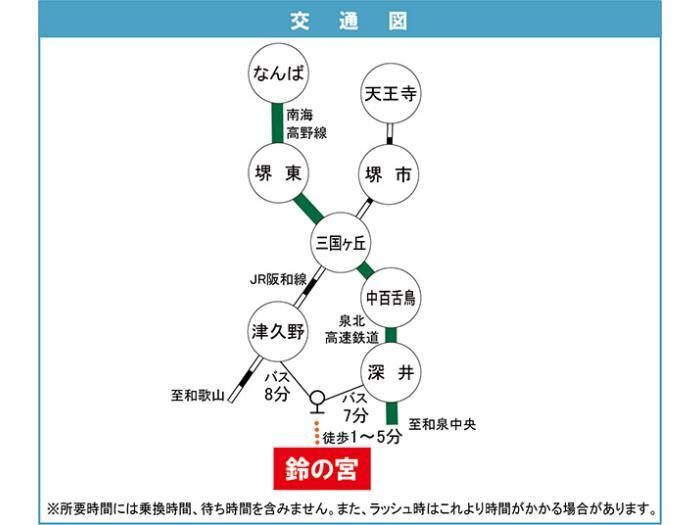 JR Hanwa Line 『 Tsukuno Station 』 8 minutes bus ( to『鈴の宮団地センター』 bus stop) + 1 minutes walk JR Hanwa Line 『 Tonoki Station 』 + 29 minutes walk |