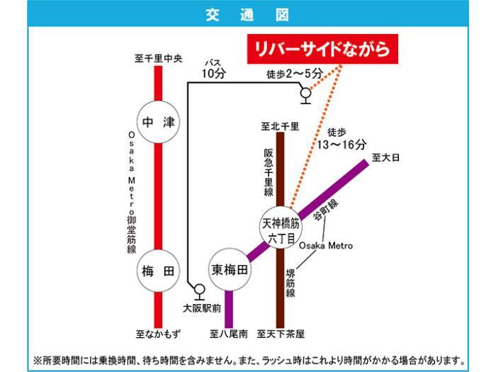 JR Osaka Loop Line 『 Osaka Station 』 10 minutes bus ( to『長柄東』 bus stop) + 2 minutes walk Osaka Metro Mido-suji Line 『 Umeda Station 』 10 minutes bus ( to『長柄東』 bus stop) + 2 minutes walk |