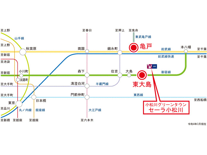 Toei Shinjuku Line 『 S17 Funabori Station 』 + 20 minutes walk JR Sobu Line 『 JB23 Kameido Station 』 14 minutes bus ( to『東大島駅入口』 bus stop) + 10 minutes walk Tobu Kameido Line 『 TS44 Kameido Station 』 14 minutes bus ( to『東大島駅入口』 bus stop) + 10 minutes walk |