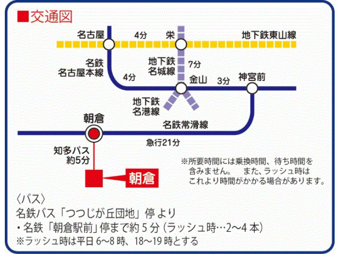 Meitetsu Tokoname Line 『 Asakura Station 』 7 minutes bus ( to『つつじヶ丘1丁目 / つつじヶ丘2丁目』 bus stop) + 1 minutes walk Meitetsu Tokoname Line 『 Komi Station 』 + 18 minutes walk |