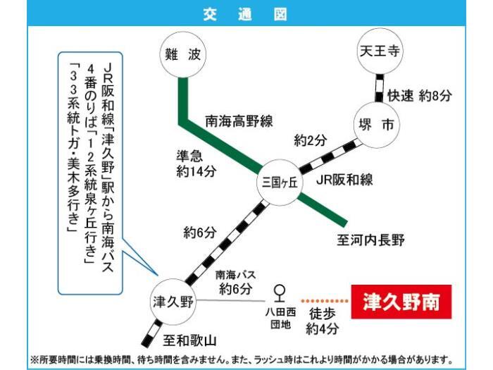 Access JR Hanwa Line Tsukuno Station 6 minutes bus ( to『八田西団地』 bus stop) + 3 minutes walk