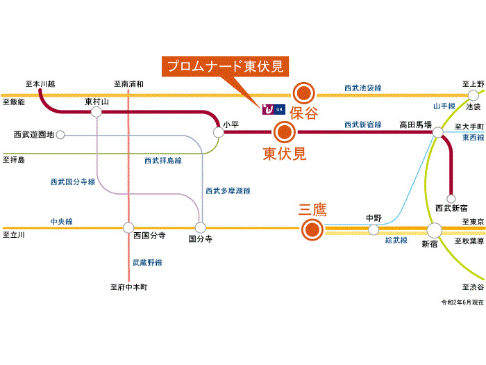 JR Chuo Line 『 Mitaka Station 』 13 minutes bus ( to『保谷中学校』 bus stop) + 4 minutes walk Seibu Ikebukuro Line 『 SI12 Hoya Station 』 6 minutes bus ( to『天神山』 bus stop) + 4 minutes walk |