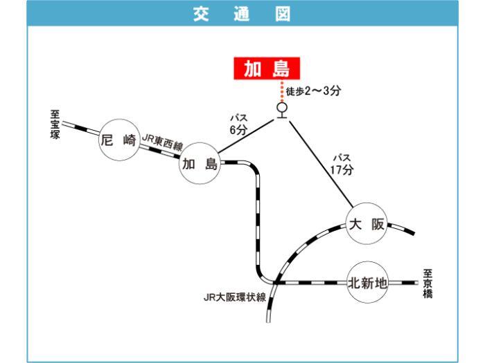 Hankyu Takarazuka Line 『 Jyu-so Station 』 8 minutes bus ( to『加島中』 bus stop) + 2 minutes walk JR Osaka Loop Line 『 Osaka Station 』 17 minutes bus ( to『加島中』 bus stop) + 2 minutes walk |