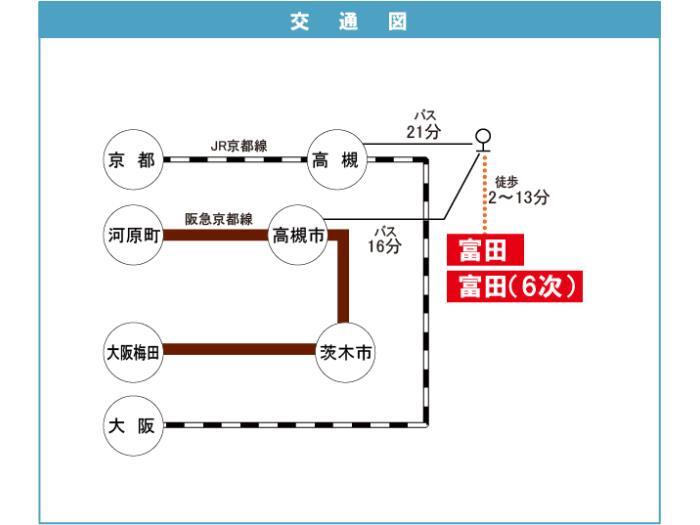 JR Tokaidou・Sanyou 『 Takatsuki Station 』 20 minutes bus ( to『富田団地中』 bus stop) + 2 minutes walk Hankyu Kyoto Line 『 Ibaraki Station 』 15 minutes bus ( to『白川三丁目』 bus stop) + 6 minutes walk |