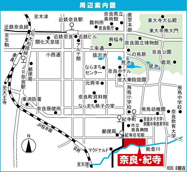 Kintetsu Nara Line 『 Kintetsu Nara Station 』 8 minutes bus ( to『紀寺住宅前』 bus stop) + 2 minutes walk JR Kansai Main Line 『 Nara Station 』 12 minutes bus ( to『紀寺住宅前』 bus stop) + 2 minutes walk |