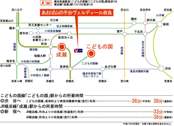 JR Yokohama Line 『 Naruse Station 』 12 minutes bus ( to『センター前』 bus stop) + 2 minutes walk Tokyu Denentoshi Line 『 Aobadai Station 』 10 minutes bus ( to『センター前』 bus stop) + 10 minutes walk |