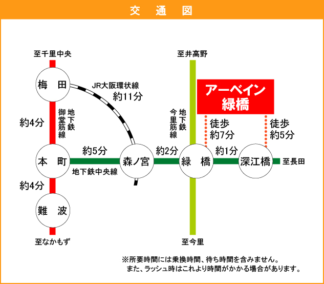Osaka Municipal Chuo Line 『 Midori Bashi Station 』 + 9 minutes walk Osaka Municipal Sennichimae Line 『 Shin-fukae Station 』 + 20 minutes walk |