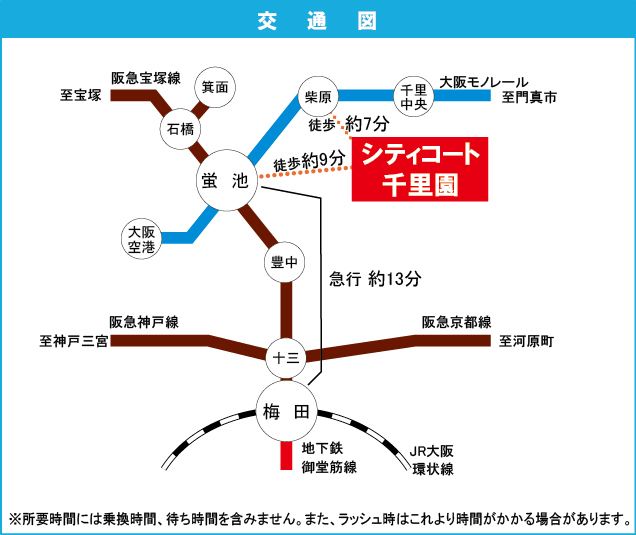 Hankyu Takarazuka Line 『 Hotaruike Station 』 + 11 minutes walk Hankyu Takarazuka Line 『 Toyonaka Station 』 + 17 minutes walk |