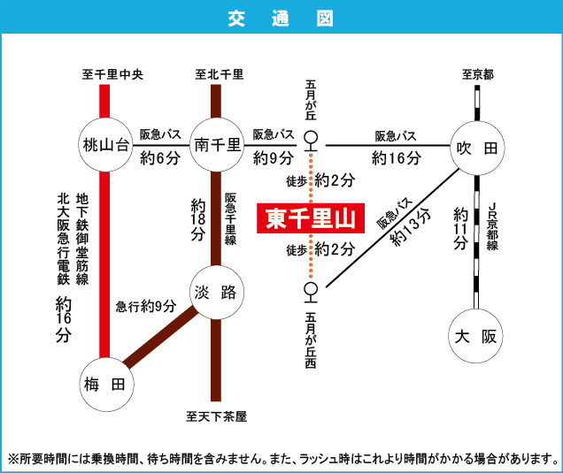 JR Tokaidou・Sanyou 『 Suita Station 』 14 minutes bus ( to『五月が丘西』 bus stop) + 2 minutes walk Kita Osaka Express Railway 『 Momoyamadai Station 』 16 minutes bus ( to『五月が丘』 bus stop) + 4 minutes walk |